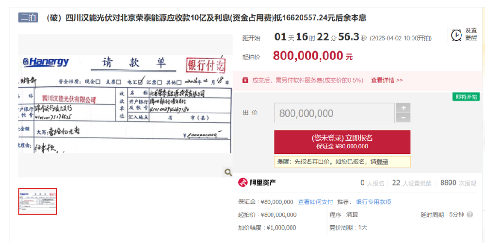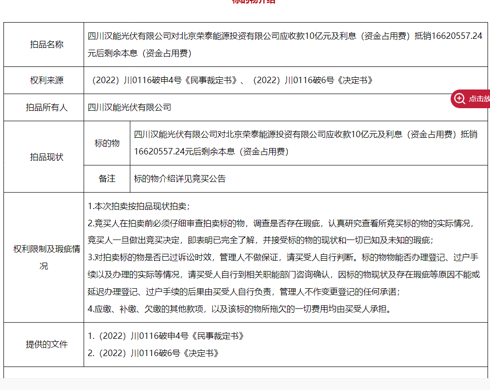 本次拍卖的标的物为“四川汉能光伏有限公司对北京荣泰能源投资有限公司应收款10亿元及利息(资金占用费)抵销16620557.24元后剩余本息(资金占用费)”。该债权资产包的起拍价定为8亿元,参与竞拍需缴纳高达8000万元的保证金。每次加价幅度为100万元或其整数倍。