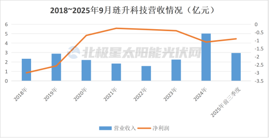 不过,深陷行业低谷,琏升科技太阳能电池毛利率也陷入负值。2025年上半年,琏升科技太阳能电池及组件业务营收同比增长83.87%,但毛利率也进一步下降。与此同时,今年前三季度,琏升科技归母净利润-0.9亿元,同比下降36.09%。2018年至今,琏升科技已连续亏损超9亿元。