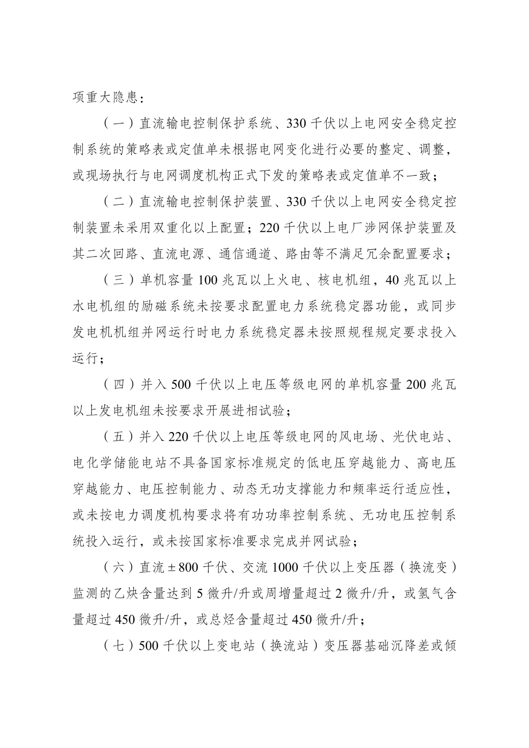 规定指出,电网或电力设备设施出现的下列任一项情形判定为一项重大隐患。其中提到,并入220千伏以上电压等级电网的风电场、光伏电站、电化学储能电站不具备国家标准规定的低电压穿越能力、高电压穿越能力、电压控制能力、动态无功支撑能力和频率运行适应性,或未按电力调度机构要求将有功功率控制系统、无功电压控制系统投入运行,或未按国家标准要求完成并网试验。